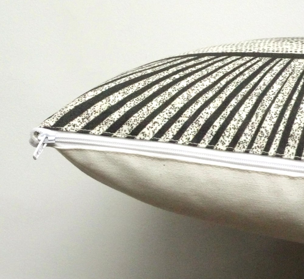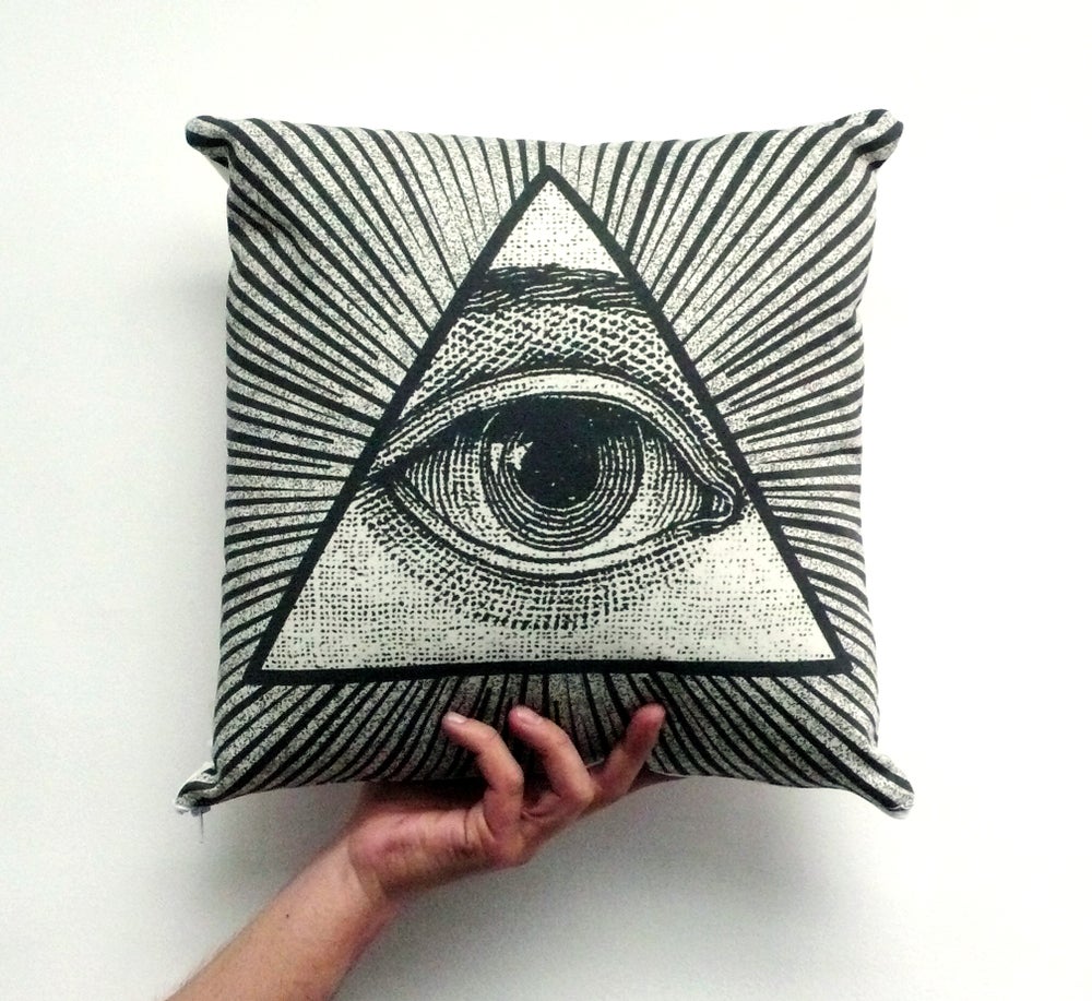 Cojín decorativo con la mítica imagen del Ojo todo lo ve, ecológicamente impresa sobre una bonita tela de algodón 100% orgánica y muy suave. La parte trasera es tela de algodón uniforme en color natural. Tiene una cremallera en la parte inferior.