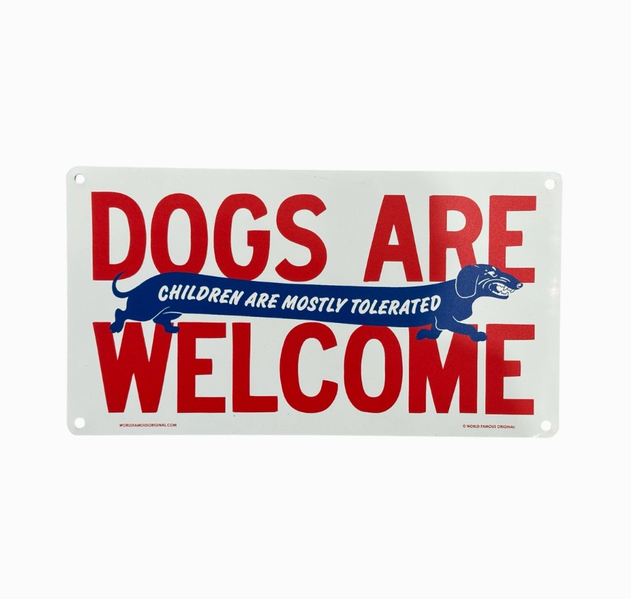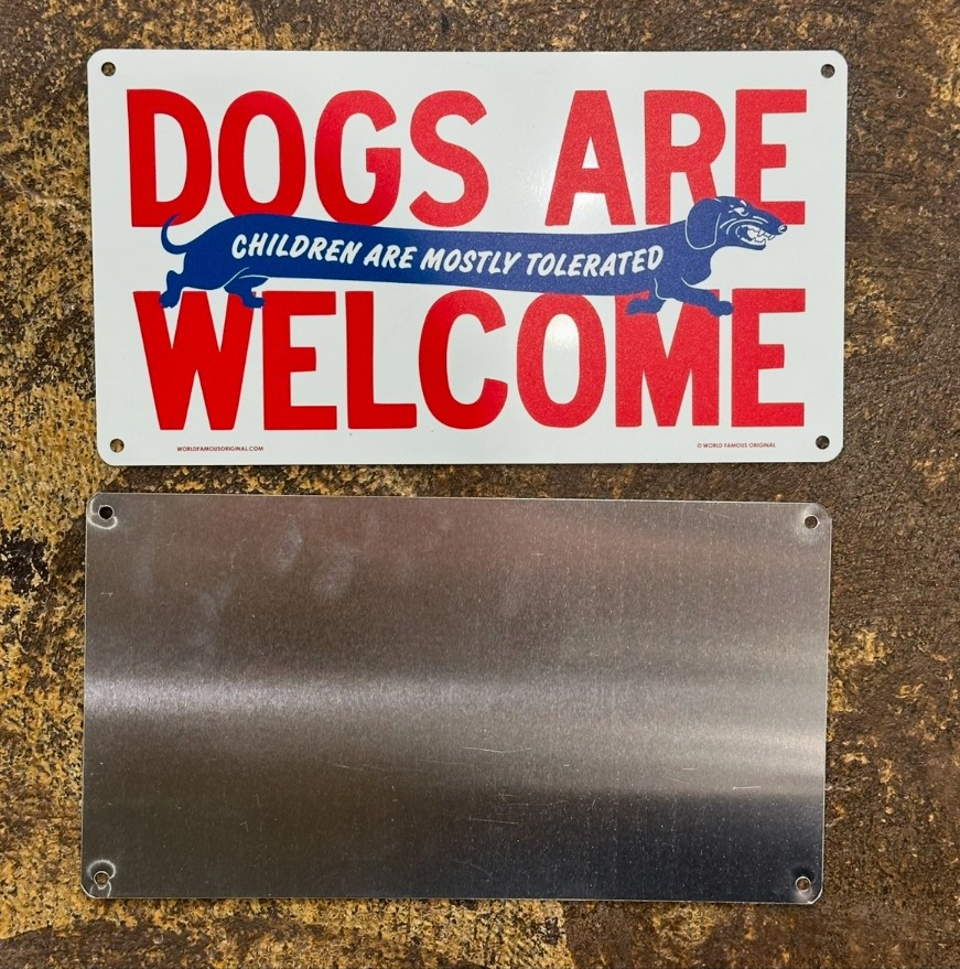 Letrero de aluminio para los amantes de los perros y, más o menos, tolerantes a los niños.