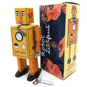 El robot X-27 Explorer es un clásico robot espacial reproducción de un juguete antiguo. Su mecanismo a cuerda, gira la llave situada a un lado del robot y mira cómo camina y balancea sus brazos.